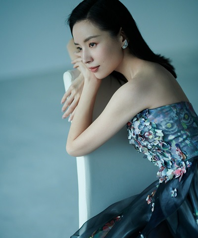 41岁董洁着抹胸花瓣长裙优雅清冷 戴珍珠坠饰秀优越肩颈线