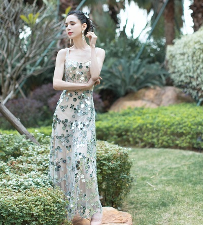 李若彤在微博分享一组美照。照片中她穿亮片吊带长裙,身材纤细,梳丸子头天鹅颈优越,气质出众。