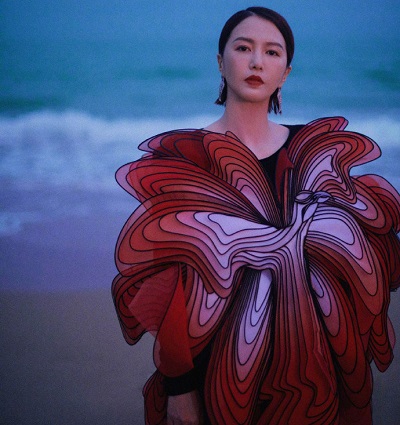 谭维维活动造型好别致,胸前身后都有红色花朵点缀,鲜红热烈,仿佛化身一朵盛放的彼岸花。