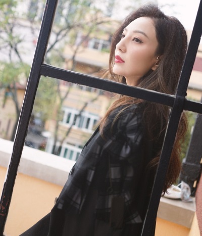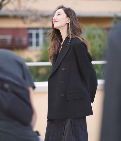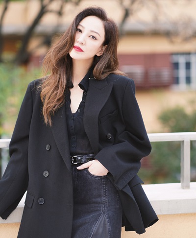 郑希怡在微博晒出工作照,照片中她身穿黑裙搭黑色西装,披肩长卷发红唇优雅有气场。