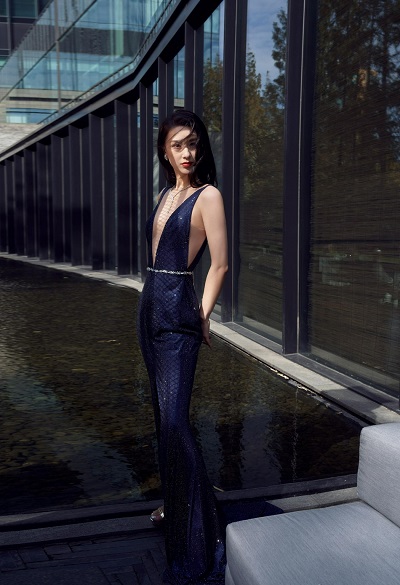 黄圣依工作室新鲜释出一组时尚活动预热图。照片中,黄圣依身穿深蓝色礼服裙,深v开到胃秀出曼妙身姿。