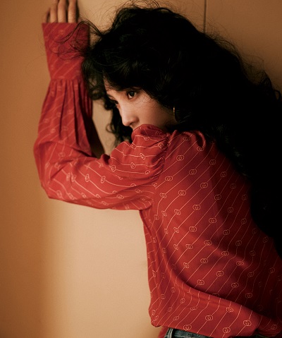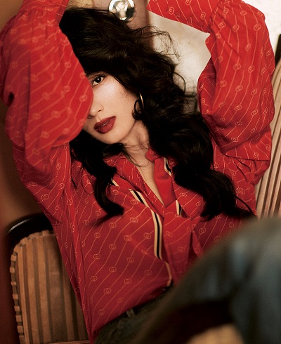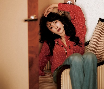 王紫璇红色衬衫搭牛仔裤复古感满满 波浪卷发妆容精致